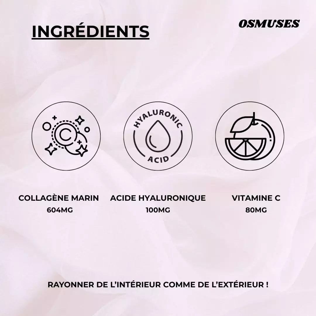 ✨ Améliore l’élasticité et la fermeté de la peau : Le collagène marin aide à renforcer la structure cutanée, réduisant visiblement les signes du vieillissement.